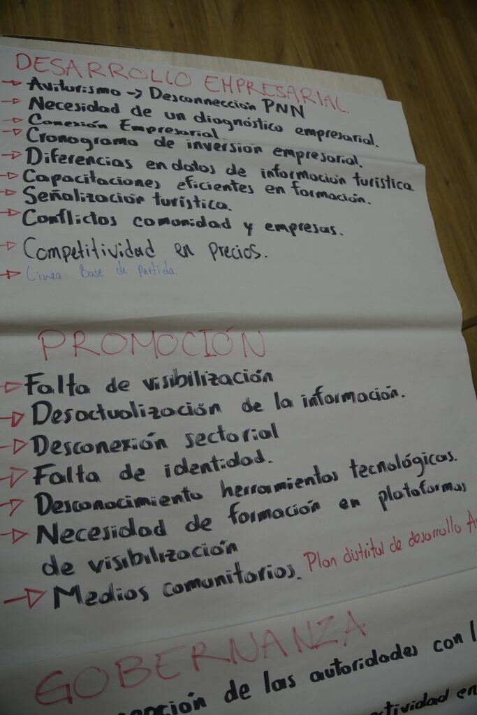 En este proceso es importante mencionar brevemente algunas de las problemáticas que han surgido en las reuniones y que hoy se reconocen como puntos críticos para el desarrollo del turismo en la localidad. Durante las sesiones, los participantes identificaron tensiones relacionadas con la gobernanza y la articulación institucional (desconexión entre autoridades y comunidad, déficit de servicios básicos y desgaste del tejido social), así como la persistencia de imaginarios negativos que han afectado la relación histórica entre el territorio y las entidades del nivel distrital y nacional. Estos elementos, escritos directamente por los asistentes en las hojas de trabajo, reflejan la necesidad de recomponer la confianza y establecer mecanismos de gestión más claros y corresponsables.